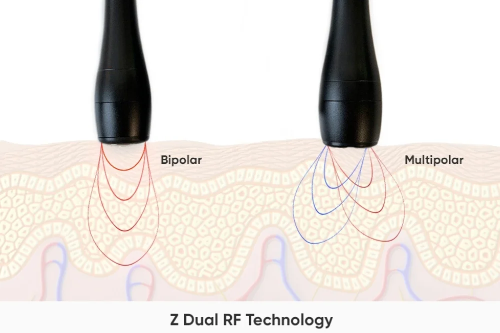 La technologie Z Dual RF combine deux approches complémentaires. La tête multipolaire chauffe uniformément un large volume du derme pour un effet global. Ensuite, la tête bipolaire cible précisément les zones spécifiques pour une pénétration profonde maximale. Cette combinaison offre le traitement le plus complet.