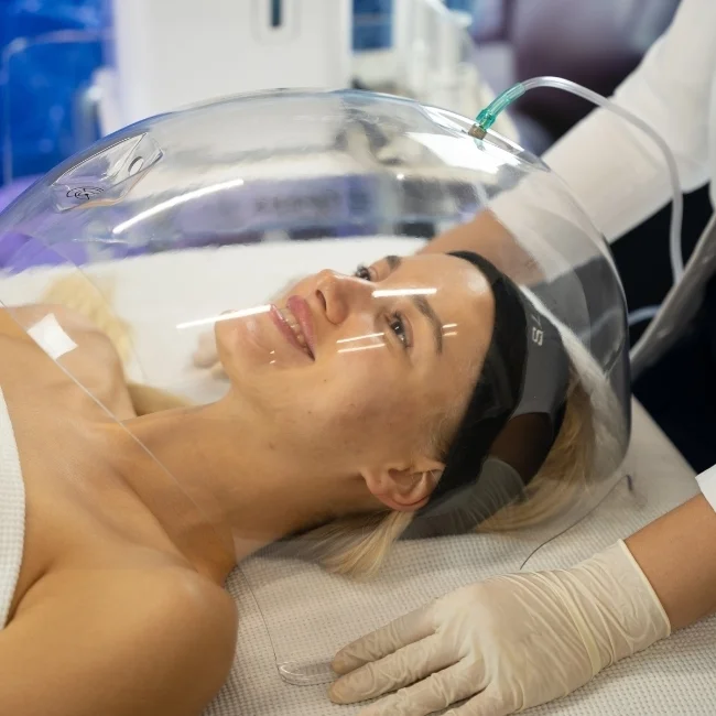 Traitement mains-libres par bain d'oxygène pur sur l'ensemble du visage. Le dôme transparent enveloppe le visage et diffuse un flux continu d'oxygène concentré, idéal pour revitaliser la peau, réduire les ridules et améliorer le teint.