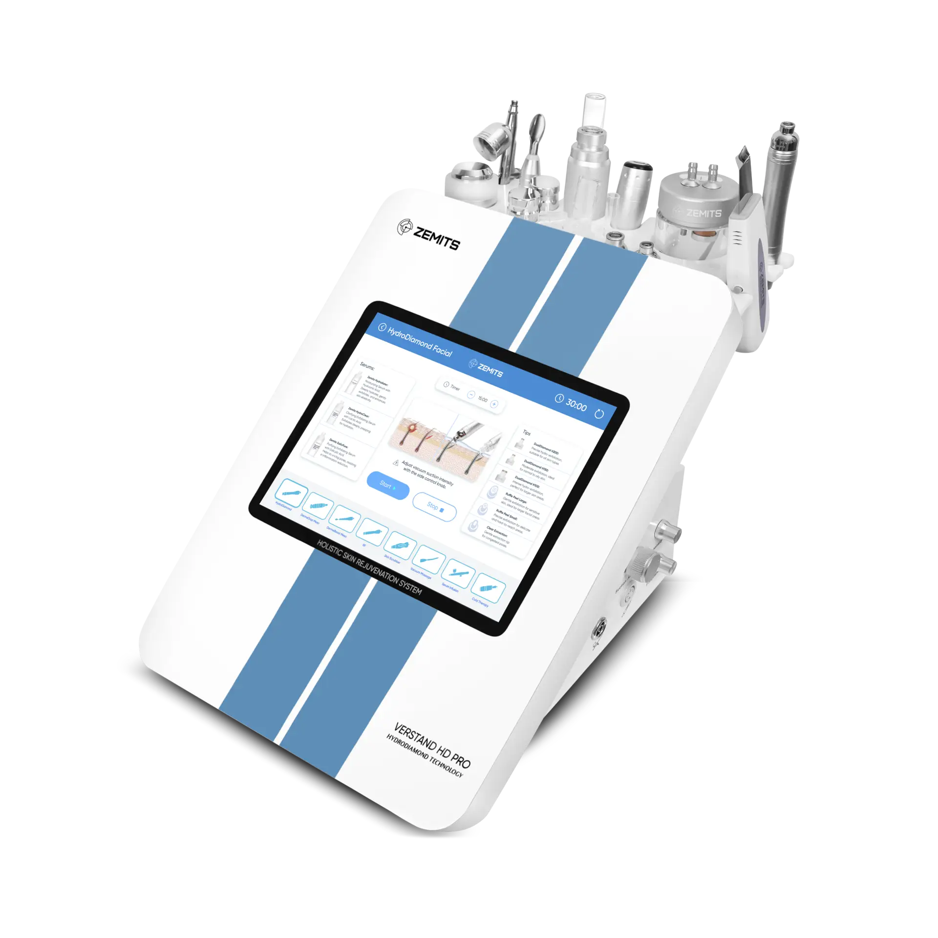 - 8 pièces à main (HydroDiamond, DermeBoost x2, O₂, Cryo, Scrubber, Vacuum, RF)